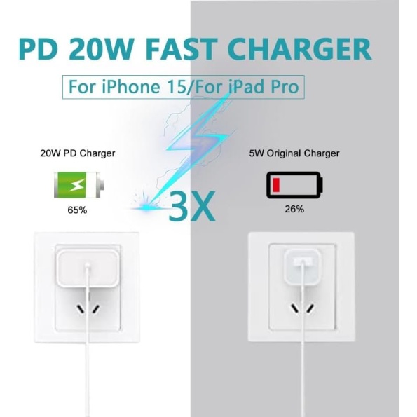 - Compatible with iPhone 15 Fast Charger USB C Wall charger provides 20W power output and charges your phone up to 50% more in just 30 minutes, which is 3 times faster than the original charger and saves you more than 1 hour.