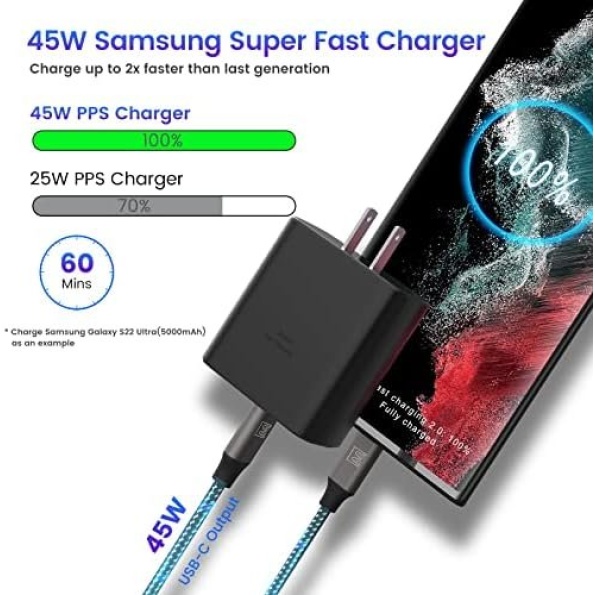 - One Fits All: – This portable 45W USB-C Charger pack is broadly compatible with almost any personal devices from phones, tablets to laptops, and especially, provides optimized charging for Samsung, [45W Super Fast Charging 2.0]: Samsung Galaxy S22 Ultra/S22 Plus/S20 Ultra/Note 10 Plus, Galaxy Tab S8/Ultra/S7/Plus; [25W Super Fast Charging 1.0]: Samsung Galaxy S23/S22/S21/S21+/S21 Ultra/FE 5G/S20/S20+/Note 20 Ultra/A71/Z Fold 4/Z Flip 4; [PD Fast Charging]: MacBook Air, iPad, iPhone, Switch…