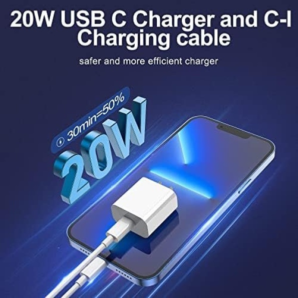 20W USB-C Fast Charger Charge your Phone 14/13/12 up to 60% capacity in just 30 minutes.bulit-in multi-protection system, avoiding from over-voltage, over-charge, over-heat, etc.Even after using the cable for a long amount of time, the cables keep their original appearance. They look brand new and fashionable even after being used!