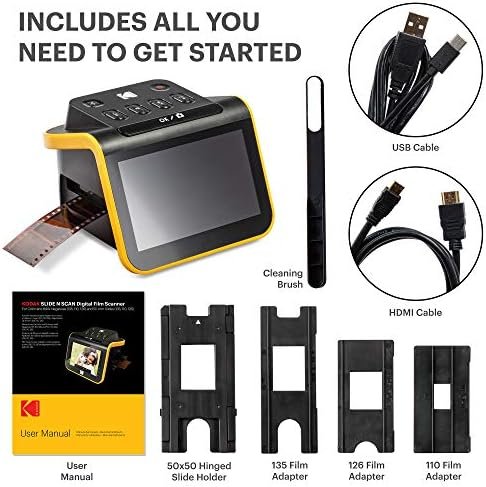 - CONVENIENT EASY-LOAD FILM INSERTS: Quick-Feeding Tray Technology Allows for Continuous Loading Action, Making Scanning Fast and Simple Includes 50mm Slide Holder, Adapters for 135, 110 and 126 Films, Cleaning Brush, USB and HDMI Cables