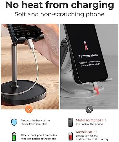 - USER-FRIENDLY DESIGN: [No bent & tangling & tip over worries] when using while charging. Due to bent cable, the low phone dock maybe fall over. LISEN stylish adjustable phone holder for desk has a reserved charging hole design, supports cable management, [No bent & tangling & tip over worries]. This phone pad will not cover the subtitle when you watch the video
