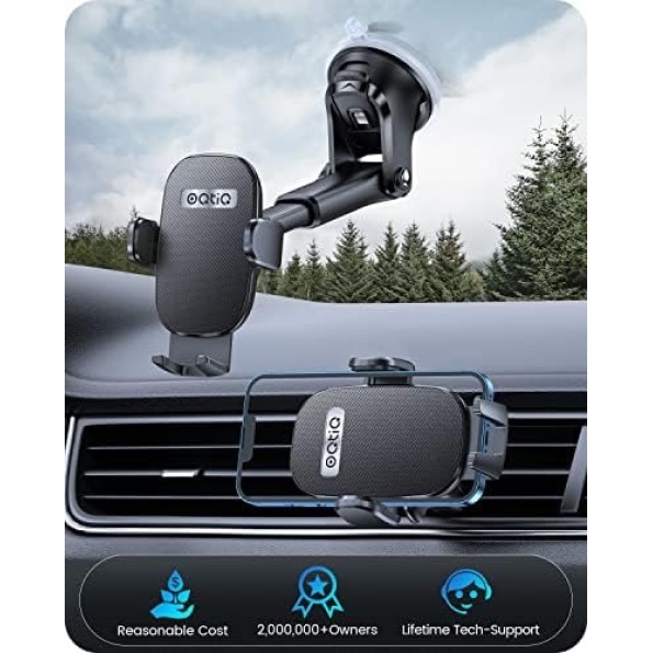 - Versatile: The OQTIQ car phone holder is an affordable, multi-functional car phone holder with an air vent clip and a suction cup that you can mount on your air vent, windshield, or dashboard. If you’re looking for a car mount that offers a little something extra, the Oqtiq phone holder is an ideal choice.