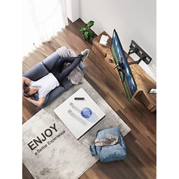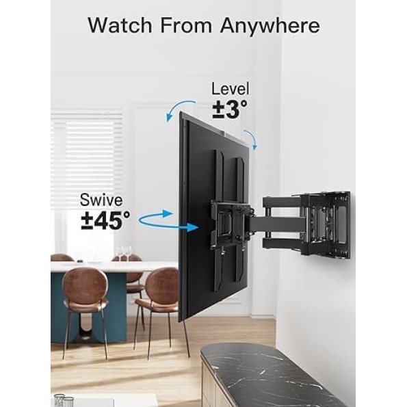 - OPTIMIZED VIEWING EXPERIENCE: This Full motion tv mount is able to reduce glare with vertical tilt ranging from +5 to -15 degrees, customize your viewing angle with +/-45 degree full motion swivel left to right., level the TV by +/-3 degrees to fine-tune the TV’s position.