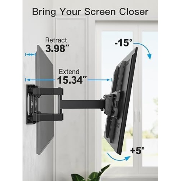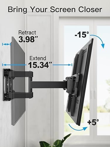 - SAVE SPACE: The stable and sturdy TV wall mount extends out 15.34 inches max for viewing and collapses to 3.98 inches from the wall to save space for a cleaner look. Great solution for rooms with multiple viewing areas.