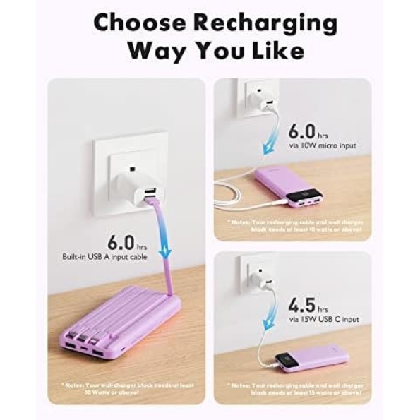 - 6 Outputs and 3 Inputs: Portable charger has 6 outputs and 3 inputs, you may charge 6 devices max at the same time, recharge battery pack with 3 options easily. Portable charger builts in 3 output cables and another 3 outputs (Total 6 outputs), great for multi electronics users who has iPhone, android or micro devices. It also builts in 3 inputs (1 built-in recharging cord/cable, 1 usb c input, 1 micro input), which you can use any one of them to recharge battery pack conveniently.