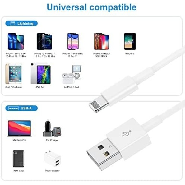 - 2 Pack 6 feet iPhone charger cable length; This iPhone charger cable allows you to conveniently charge your device in the bedroom, sofa, office, and travel, even if you are in the back seat of the car