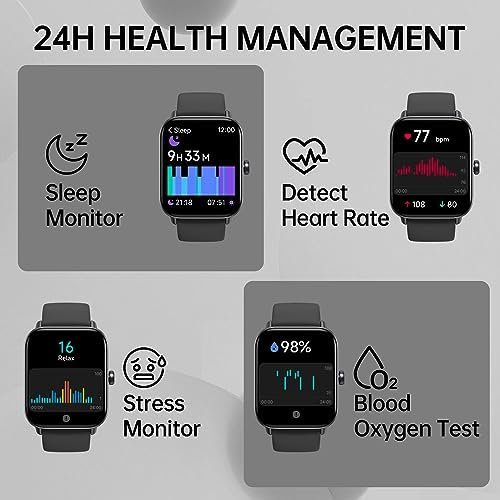 - All-day health tracking, in-depth health care: The fitness tracker watch contains heart rate monitor, blood oxygen (SpO2) monitor, step tracker, sleep monitor, stress monitor and more. This smart watch can take care of your physical and mental health, perfect watch for women and men.