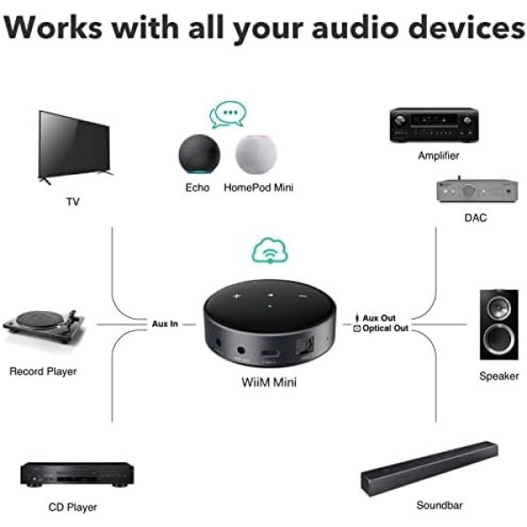 - SEAMLESS MULTIROOM STREAMING – Experience the ultimate convenience of streaming music throughout your entire home with WiiM Mini. Enjoy seamless integration with a range of smart speakers, such as AirPlay 2 and our exclusive multiroom feature. Effortlessly form groups with other AirPlay 2 or Alexa devices like Echo and HomePod, or connect multiple WiiM devices for synchronized playback across various audio devices simultaneously.
